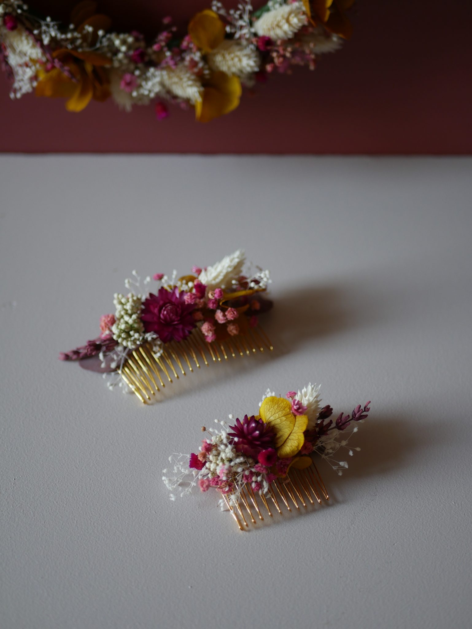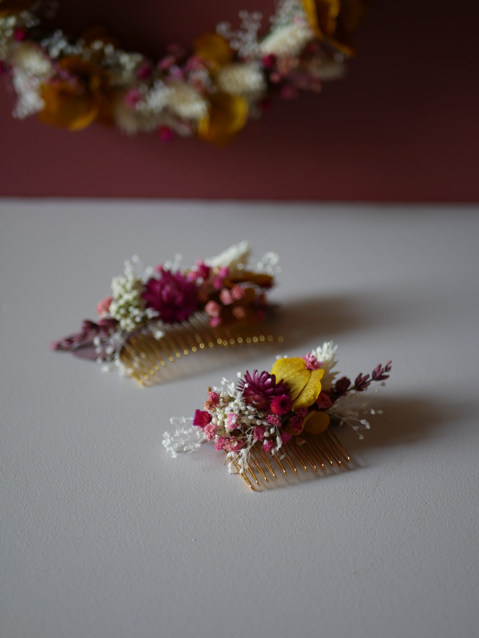 Les fleurs séchées et stabilisées se conservent des années. Cependant les couleurs peuvent varier légèrement au fil du temps. Aussi, cet article est livré avec un guide comportant quelques conseils pour entretenir votre peigne. Pour vos accessoires, l’idéal est de les conserver à l’abris, dans une boite à bijoux.